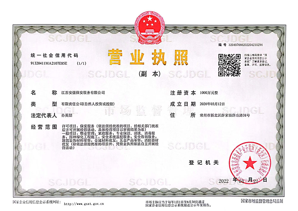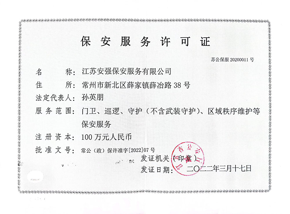 江蘇安強(qiáng)保安服務(wù)有限公司經(jīng)江蘇省公安廳批準(zhǔn),安強(qiáng)保安取得保安許可服務(wù)證資質(zhì),批準(zhǔn)文號(hào):常公(行)保許準(zhǔn)字【2020】03號(hào),并于工商登記機(jī)構(gòu)合法注冊(cè)的從事現(xiàn)代安防業(yè)的綜合服務(wù)企業(yè),是目前常州市一家新型的專(zhuān)業(yè)化、規(guī)范化、科學(xué)化、現(xiàn)代化的服務(wù)型企業(yè)。